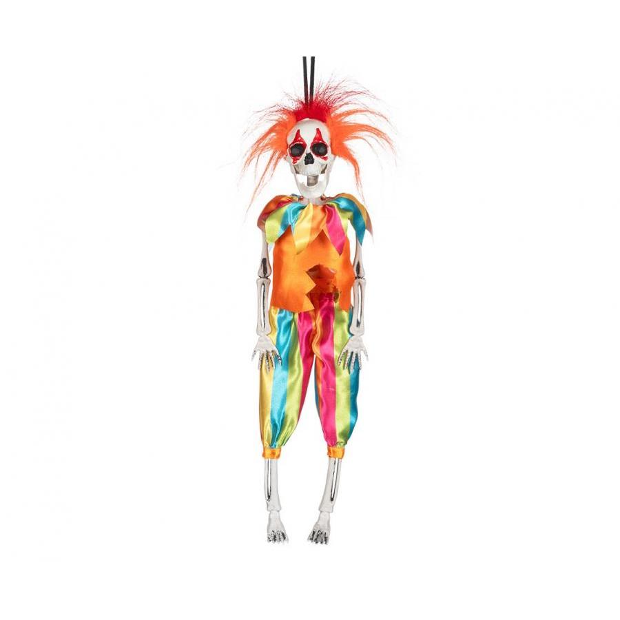 Kościotrup Klaun to efektowna dekoracja wisząca, idealna na Halloween lub imprezy tematyczne. Ma około 40 cm wysokości i charakteryzuje się nietypowym połączeniem motywu klauna z elementami grozy. Ciało kościotrupa jest zazwyczaj wykonane z lekkiego tworzywa, co ułatwia zawieszenie dekoracji w różnych miejscach, takich jak drzwi, sufity czy okna.